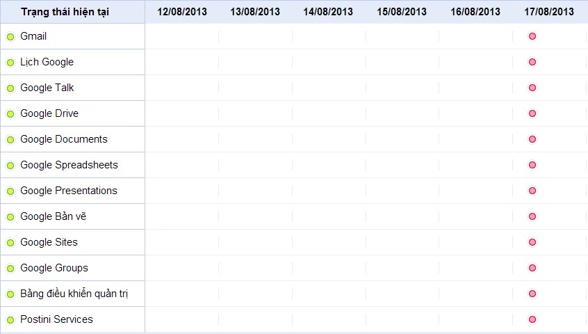 "Chúng tôi nhận thấy sự cố với Gmail làm ảnh hưởng đến số lượng lớn người dùng. Người dùng bị ảnh hưởng có thể truy cập Gmail, nhưng họ sẽ thấy thông báo lỗi và/hoặc hành vi không mong muốn. Chúng tôi sẽ cung cấp bản cập nhật vào 07:37 17/08/2013 (giờ Việt Nam) để thông tin chi tiết khi nào chúng tôi giải quyết sự cố. Hãy lưu ý rằng thời gian giải quyết này mang tính ước tính và có thể thay đổi" - thông báo của Google đăng tải tại www.google.com/appstatus sau hai tiếng xảy ra sự cố.