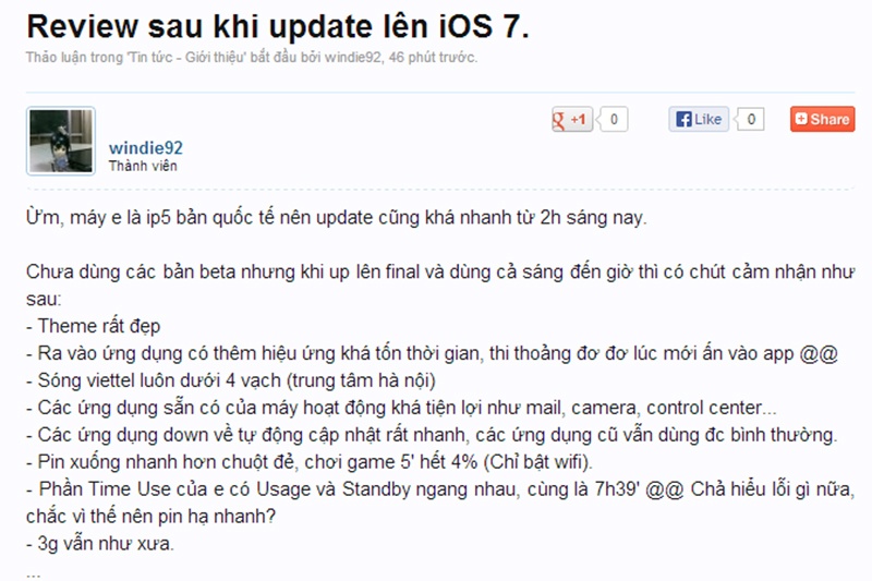 | Cảm nhận sau khi update lên iOS 7 của một thành viên diễn đàn tinhte.vn |