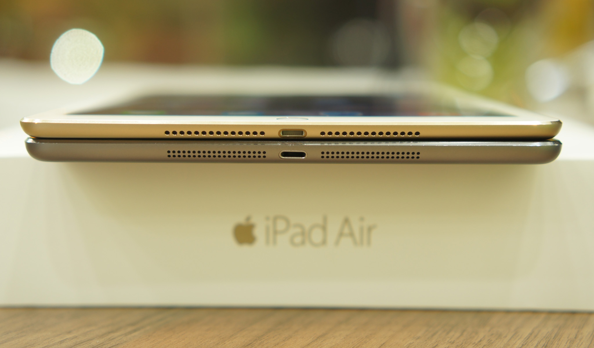 | Điểm khác biệt về ngoại hình dễ nhận thấy nhất của iPad Air 2 (trên) so với phiên bản trước chính là cảm biến vân tay Touch ID . Touch ID giúp tăng cường khả năng bảo mật, giúp mở khóa màn hình, hay mua ứng dụng trên App Store không cần nhập mật khẩu. |
