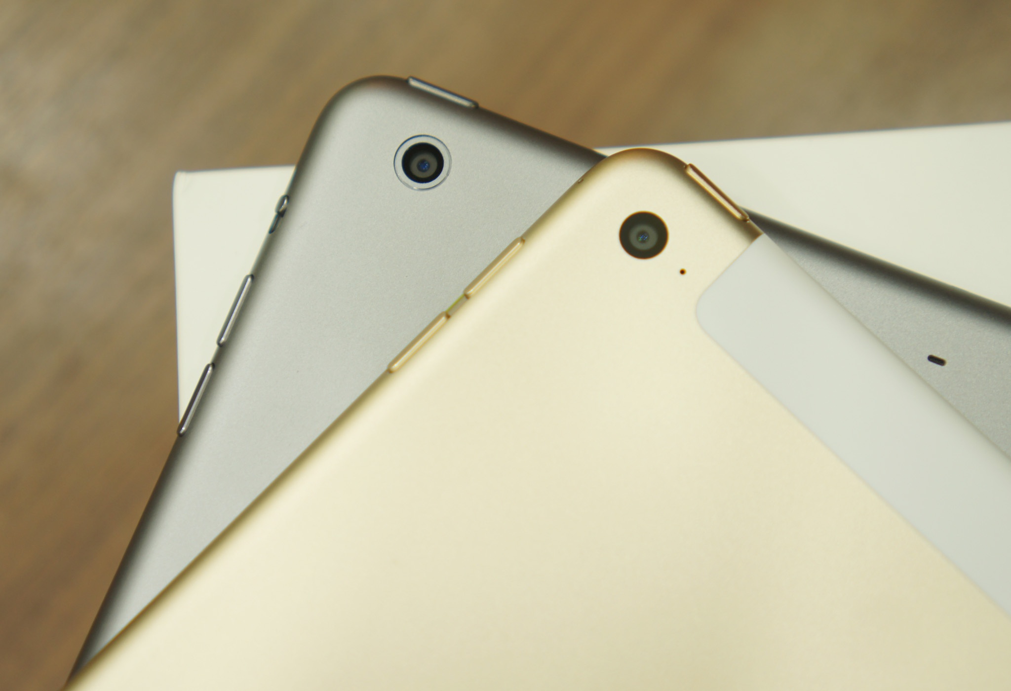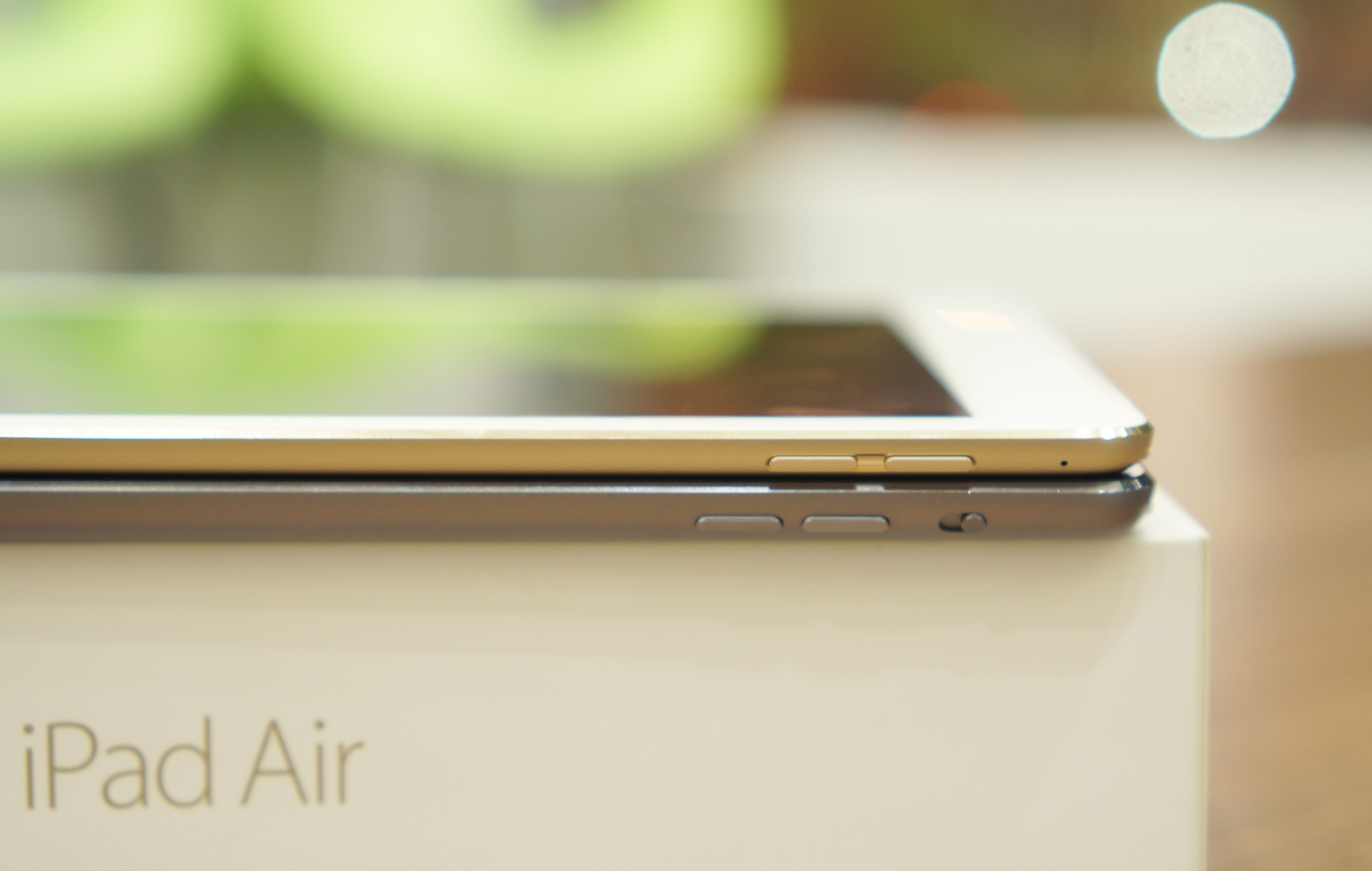 Cần gạt để khóa chuông hay xoay màn hình đã hoàn toàn biến mất trên iPad Air 2 (bên trên). Các phím tăng, giảm âm lượng của máy cũng được làm chìm hơn.