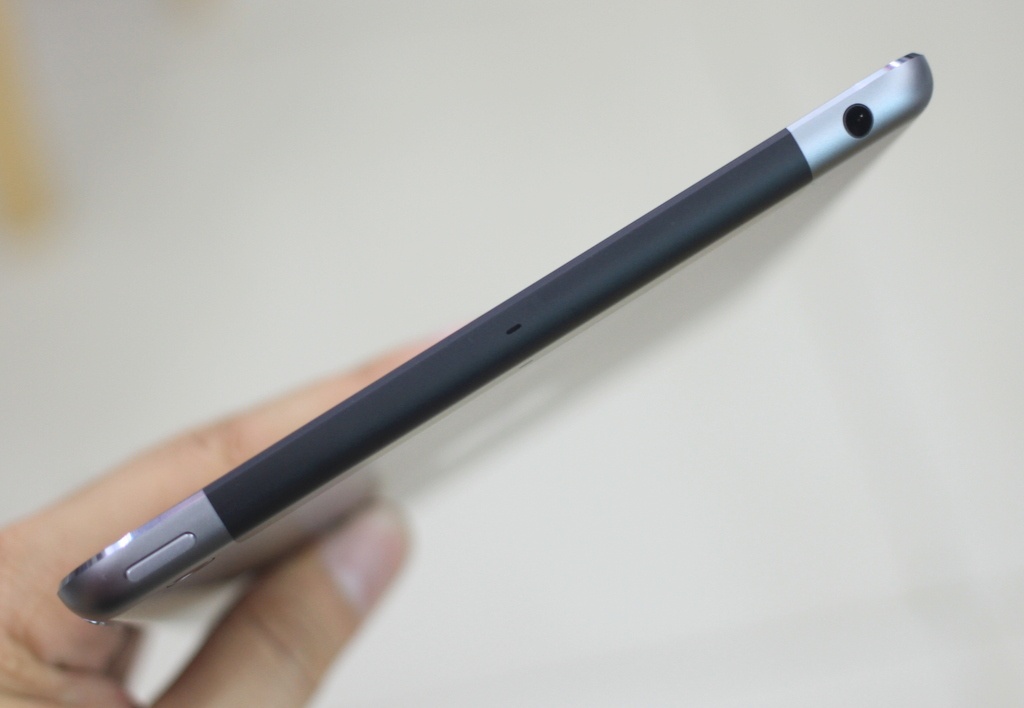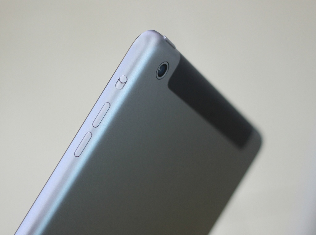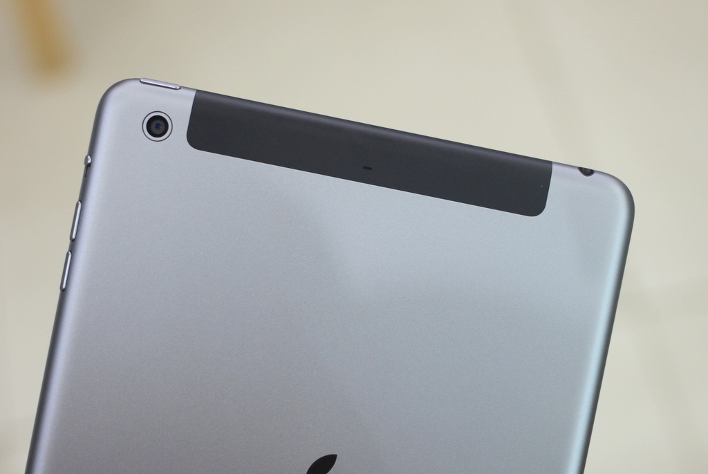 | Mặt sau máy. Khác với bản iPad Mini Wi-Fi, phiên bản 4G có thêm phần nhựa đen bên trên. |