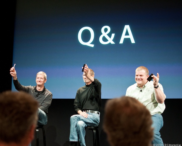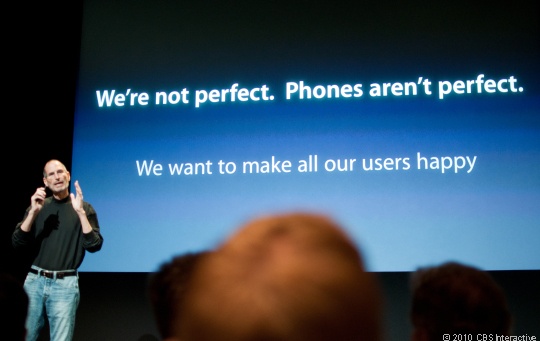 | Sau một thời gian ra mắt, iPhone 4 dính phải lỗi mất sóng nghiêm trọng khiến Apple phải tổ chức họp báo. Jobs khẳng định: "Chúng tôi không hoàn hảo. Những chiếc điện thoại cũng vậy". |