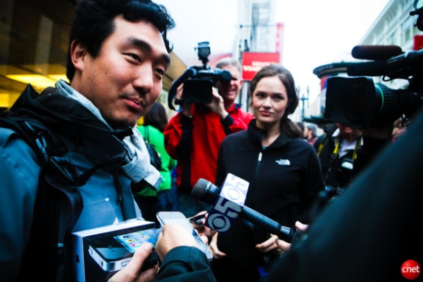 | Những khách hàng đầu tiên của iPhone 4 luôn được báo chí săn đón ở ngoài các cửa hàng Apple. |