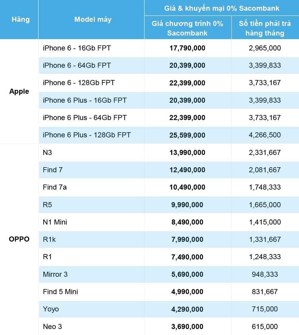 Quý khách có thể tham khảo chi tiết bảng giá trả góp Sacombank được TechOne áp dụng với các hãng: Samsung, Asus, Phillips, HTC, BlackBerry... tại đây.