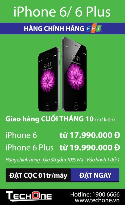 Hoặc khách có thể liên hệ đặt trước sản phẩm iPhone 6/6Plus (FPT) sẽ chính thức lên kệ TechOne vào cuối tháng 10 từ hôm nay để nhận gói quà trị giá tới 3 triệu bao gồm: Gói bảo hành lỗi một đổi một trong 2 năm và nhiều phần quà hấp dẫn khác (Đặt hàng)