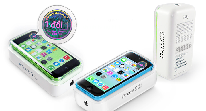 Sản phẩm iPhone 5C được phân phối cho thị trường Việt Nam nên máy có mã hàng hóa (part number) kết thúc bằng ký hiệu “VN/A”, đi kèm với hướng dẫn sử dụng bằng tiếng Việt. Sản phẩm được đóng gói nguyên seal (bao nilon ngoài vỏ hộp) từ nhà máy Apple, có tem nhập khẩu dán mặt sau và tem chính hãng dán mặt trước để người tiêu dùng dễ nhận biết.