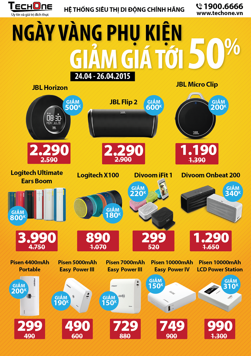Phiên chợ phụ kiện cuối tuần của TechOne lại nhộn nhịp với chương trình giảm giá lên tới 50%. Tại phiên chợ cuối tuần, TechOne giảm giá toàn bộ loa chính hãng JBL, loa Logitech, pin sạc dữ trữ dành cho dế yêu với những chuyến du lịch dài ngày vào mùa hè.