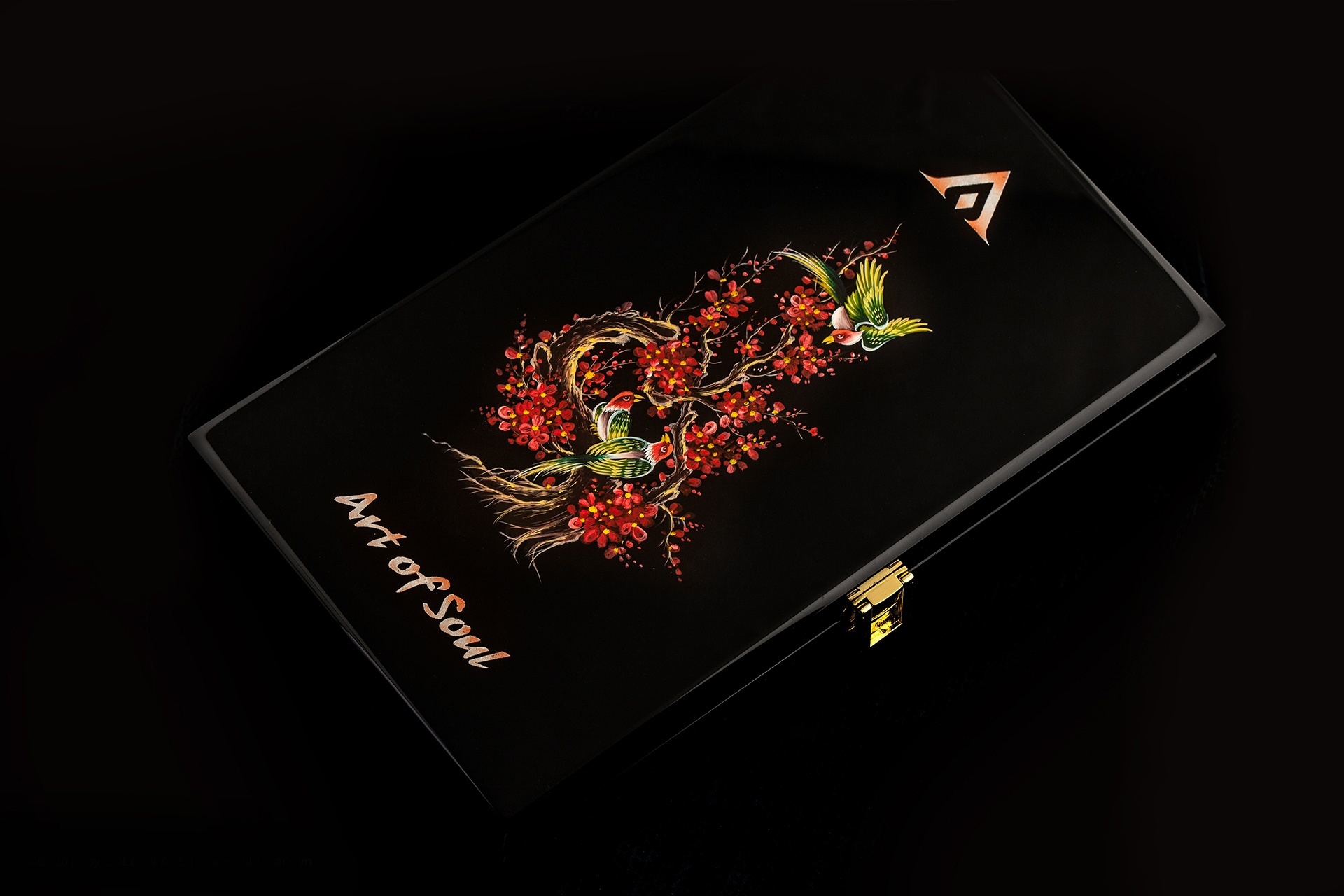 | Hộp của sản phẩm được làm bằng sơn mài với bức tranh chạm được vẽ thủ công bên ngoài. |
