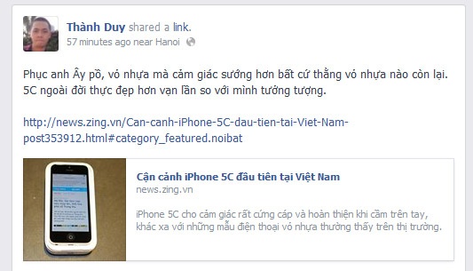 Ngoài ra, anh này cũng khen: "Apple rất khôn khéo khi gia cường cho vỏ nhựa trên 5C một lớp kim loại bên trong để tăng độ cứng cáp, bên cạnh lợi ích thứ hai là ăng-ten. Sau một thời gian ngắn cầm máy trên tay, mình thấy rằng iPhone 5C là một chiếc điện thoại đẹp, rất cứng cáp với các góc cạnh được bo mềm mại. Có thể lớp nhựa bóng sẽ khiến máy dễ xước hơn nhưng đó không phải vấn đề quá lớn nếu bạn đặt cái đẹp lên hàng đầu". Nhiều phóng viên công nghệ sau khi được trực tiếp cầm máy và trải nghiệm cũng có chung nhận định với Didu.