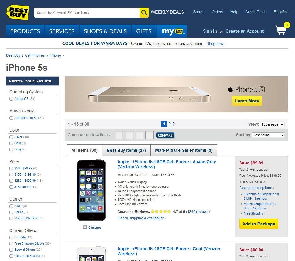 Tuy chưa đến gần thời điểm Apple ra mắt iPhone 6, nhưng giá bán iPhone 5S tại Mỹ đã bắt đầu có dấu hiệu giảm mạnh. Trên website Apple Store, giá bán iPhone 5S 16GB chính hãng kèm hợp đồng 2 năm với nhà mạng vẫn ở mức 199 USD, nhưng tại các nhà bán lẻ như Walmart, Best Buy, Radio Shack,.. giá của sản phẩm này giảm còn 99 USD.