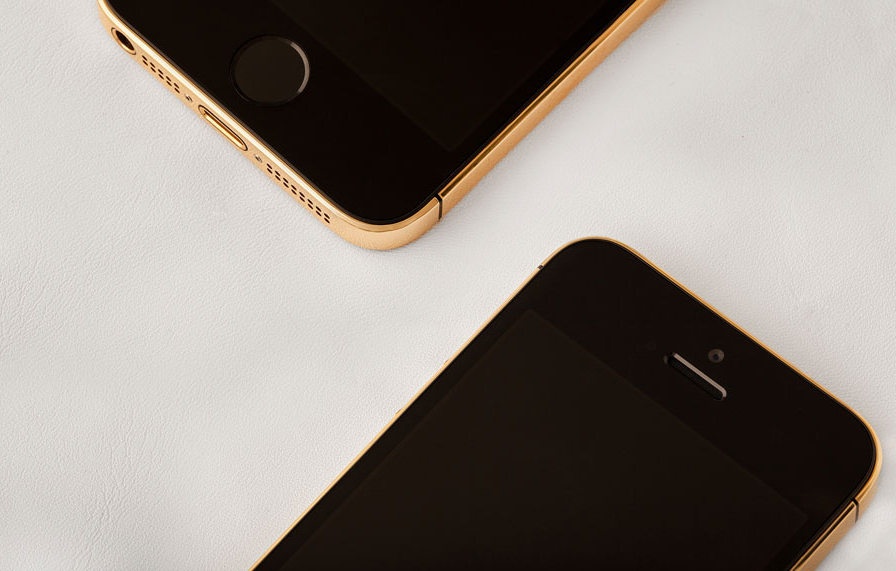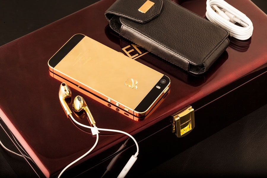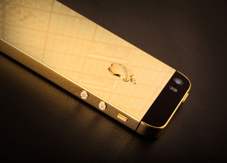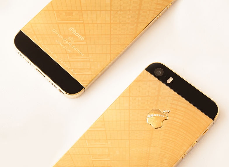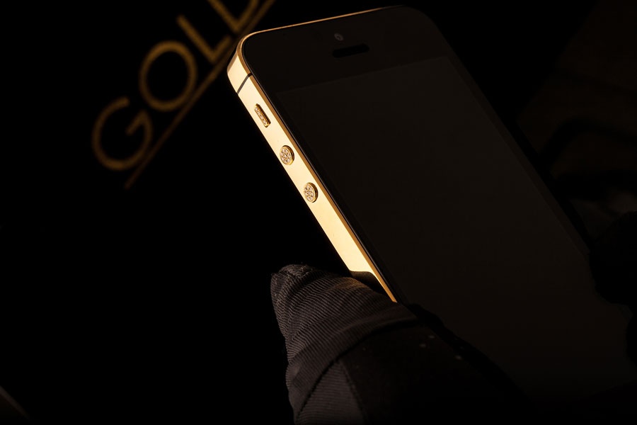 | iPhone 5S phiên bản Glossy Gold được chế tác thủ công trong vòng 14 tiếng đồng hồ từ mẫu iPhone 5S đen xám hoặc trắng bạc. Mọi chi tiết, góc cạnh đều được chăm chút tỉ mỉ. Các phím bấm ở cạnh bên được nạm kim cương. |