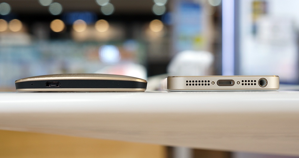 | HTC One vàng "to xác" hơn iPhone 5S Gold nhưng vẫn tạo cảm giác mảnh mai. Khi nhìn từ góc này, iPhone cho cảm giác mạnh mẽ và chắc chắn. |