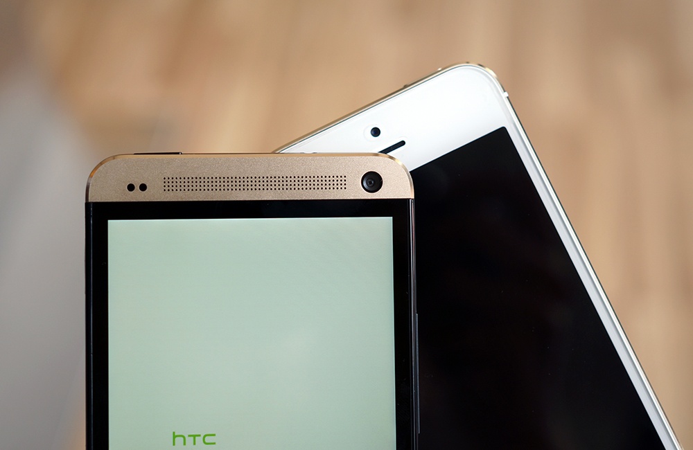 Phần trên mặt trước của HTC One so với iPhone 5S cũng thể hiện được hai phong cách thiết kế khác nhau: HTC bố trí nhiều bộ phận tiện ích ở mặt trước và dùng chính những chi tiết đó để tô điểm cho thiết kế, còn Apple chủ trương đơn giản hóa mặt trước của iPhone để hướng ánh mắt người dùng vào màn hình.