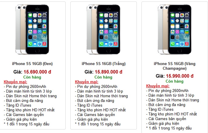 Hơn 2 tháng sau khi lên kệ, giá bán của iPhone 5S xách tay đã xuống mức dưới 16 triệu đồng. Hiện tại, bản iPhone 5S màu trắng hoặc màu xám, 16 GB được một số cửa hàng chào bán với giá 15,7 triệu đồng. Có một điểm đáng chú ý khác là bản màu vàng champagne đã không còn chênh lệch nhiều so với các màu còn lại – chỉ cao hơn từ 200.000 đồng đến 400.000 đồng.