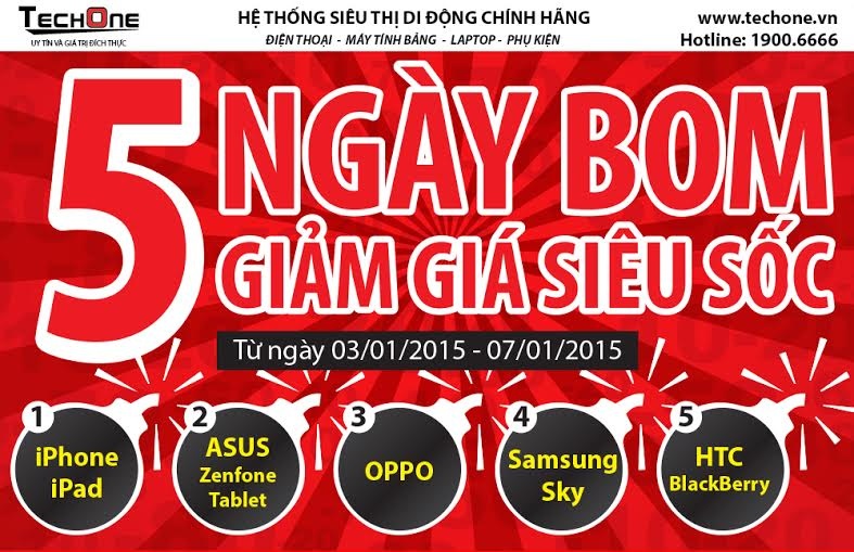 Nhân dịp Xuân năm mới 2015, từ 3/1 đến 8/1 TechOne triển khai chương trình Bomb giá 5 ngày vàng với hàng loạt sản phẩm đến từ các thương hiệu danh tiếng: iPhone, Samsung, Asus, BlackBerry… được giảm giá lên tới 3 triệu đồng trừ thẳng vào hóa đơn mua hàng. Mỗi ngày khách sẽ có cơ hội mua các sản phẩm thuộc 1 - 2 thương hiệu tên tuổi với giá giảm bất ngờ và nhiều phần quà giá trị. Đặc biệt chế độ bảo hành không thay đổi, áp dụng cả hình thức mua hàng trả góp và mua online.