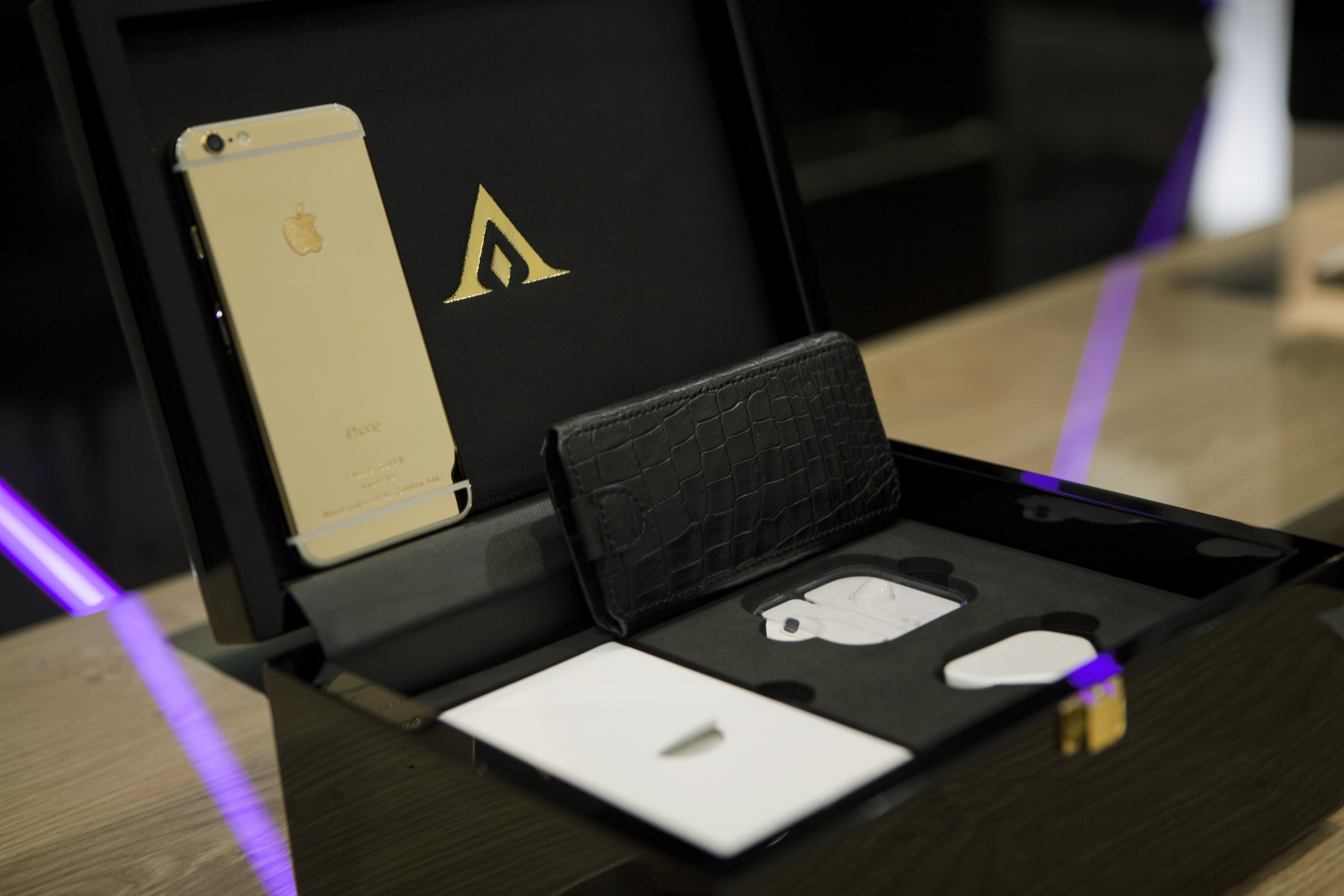 | Phiên bản Glossy Gold II (vàng bóng) và phụ kiện được đựng trong một riêng kèm bao da cá sấu. |