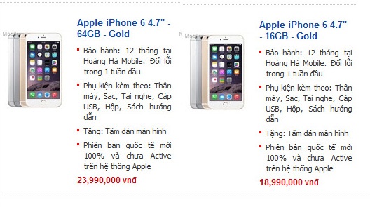 Do nguồn hàng ít, một số đơn vị đã chủ động tăng giá vài trăm nghìn, thậm chí cả triệu đồng dành cho mẫu iPhone 6 các bản 16 và 64 GB. Riêng bản 128 GB – do khó bán – nên giá bán gần như không thay đổi. Hiện tại, iPhone 6 bản 16 GB được bán phổ biến ở mức gần 19 triệu đồng, iPhone 6 64 GB khoảng 24 triệu đồng. Riêng bản iPhone 6 128 GB ít cửa hàng bán hơn, giá xấp xỉ mức 25,5 triệu đồng.