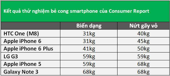 Thử nghiệm của Consumer Reports cho thấy iPhone 6 và 6 Plus tuy có thể bị biến dạng, nhưng chắc chắn hơn nhiều so với clip thử nghiệm bằng tay trước đó. Nhân vật thử nghiệm mới đây cũng cho biết anh sẽ thực hiện lại clip bẻ cong iPhone 6, do clip trước đó có một số điểm khiến người xem nghi ngờ tính trung thực.