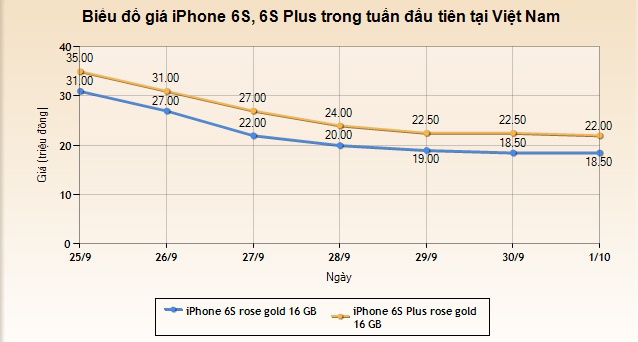 Ở thời điểm ngày 25/9, không tính những màn chào giá có phần ảo, lên đến 68 triệu đồng cho một vài chiếc iPhone 6S Plus 128 GB, giá bán iPhone 6S vàng hồng 16 GB phổ biến ở mức 31-33 triệu đồng, iPhone 6S Plus khoảng 35 triệu đồng. Sau 7 ngày, giá bán của 2 model này hiện ở mức 18,5 và 22 triệu đồng. Điều đó có nghĩa, iPhone 6S (màu rose gold) đã giảm khoảng 12,5 triệu đồng, trong khi iPhone 6S Plus giảm 13 triệu đồng sau 7 ngày. Mức giảm này cao hơn khoảng 2-3 triệu so với iPhone 6 và 6 Plus năm ngoái, vốn được xem là năm thị trường iPhone loạn nhất.