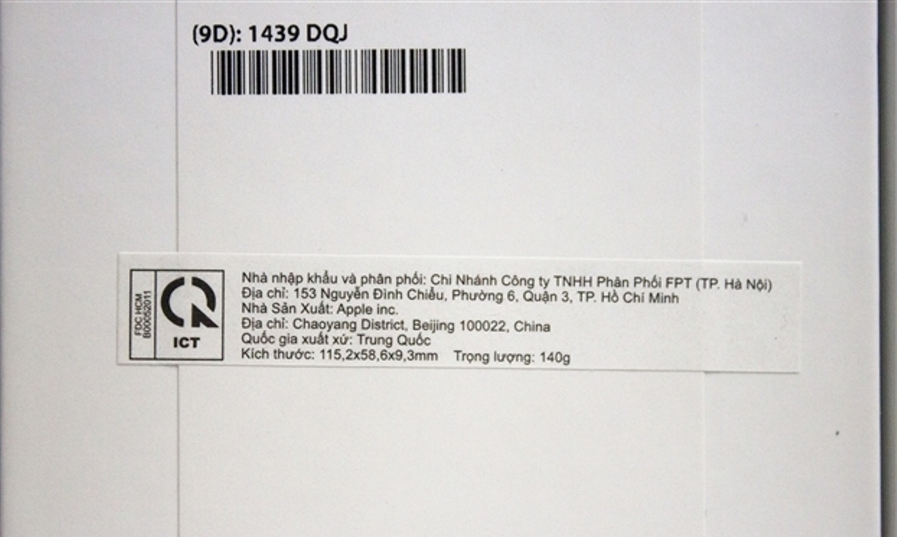 | iPhone FPT trôi bảo hành với tem ICT phía mặt sau của vỏ hộp. |