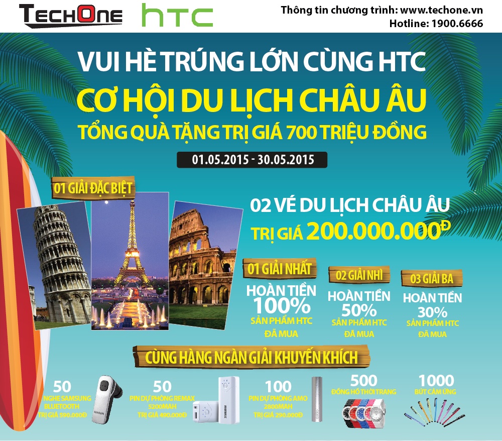 Bên cạnh đó, khách hàng mua điện thoại HTC sẽ nhận thẻ cào may mắn cơ hội trúng chuyến du lịch châu Âu trị giá 200 triệu dành cho 2 người, có cơ hội được hoàn tiền 100% sản phẩm HTC đã mua và nhận hàng nghìn giải khuyến khích với thẻ cào 100% trúng thưởng. Tham khảo về chương trình tại http://www.techone.vn.