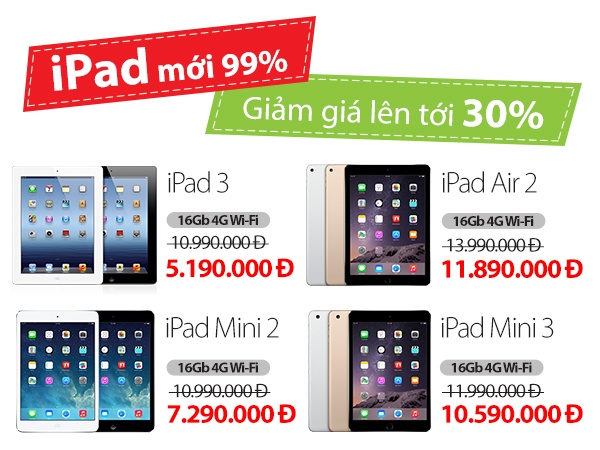 - iPad 3 16 GB 4G Wi-Fi mới 90% giá chỉ 5,19 triệu đồng (giá cũ 10,99 triệu đồng)