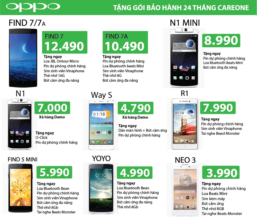 - OPPO R1: Giá cũ: 8,9 triệu đồng, tặng ngay một triệu đồng. Chỉ còn 7,9 triệu đồng, cùng bộ quà tặng trị giá 2,4 triệu đồng.