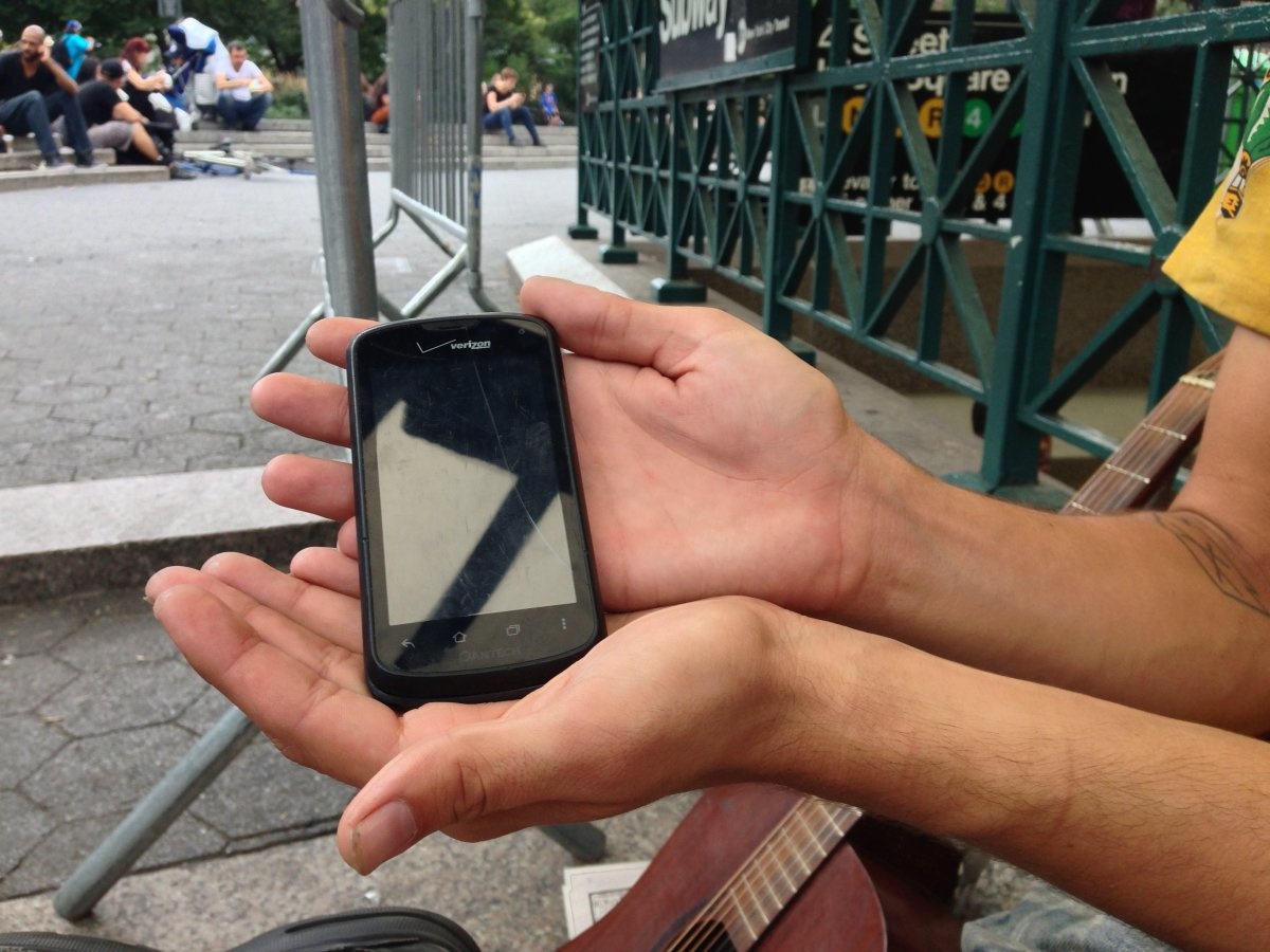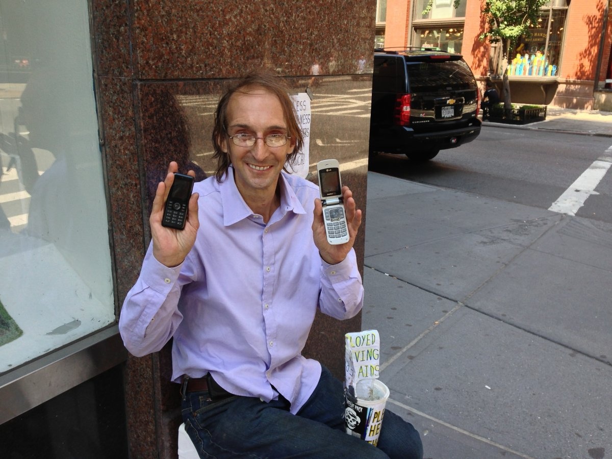 Anh dùng một chiếc điện thoại của nhà mạng AT&T để nhắn tin và tìm việc.