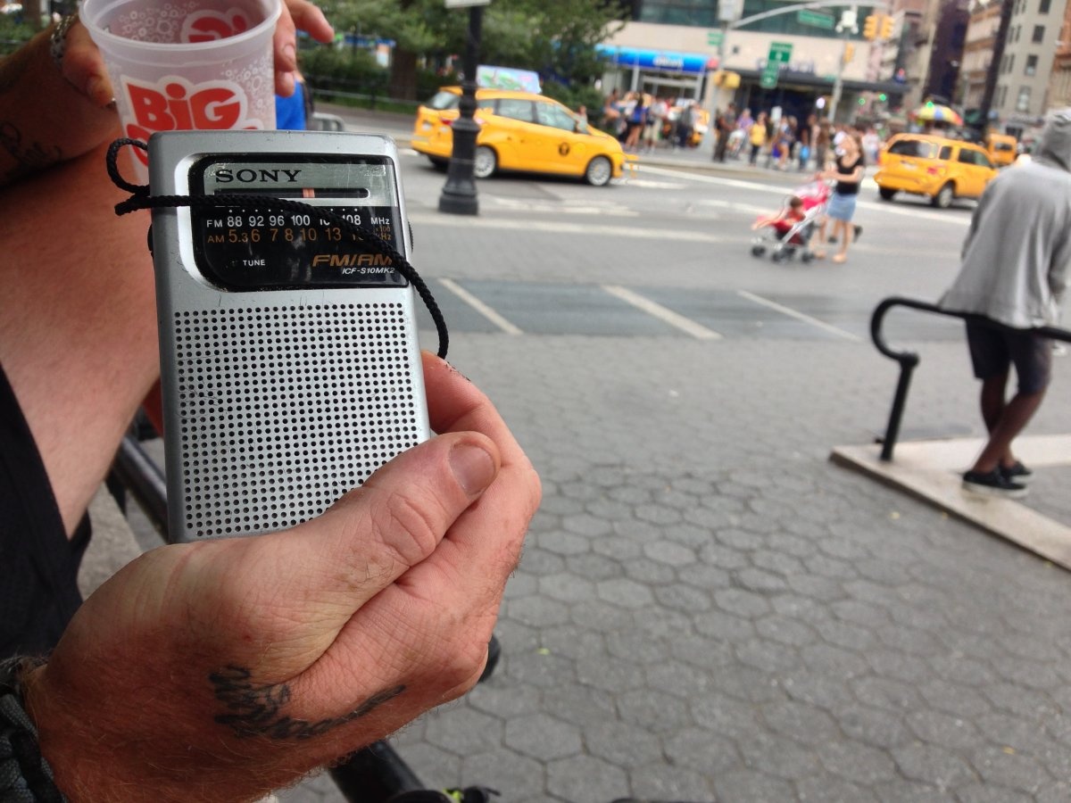| Ông dùng một chiếc radio di động của Sony để nghe ESPN End Zone. |