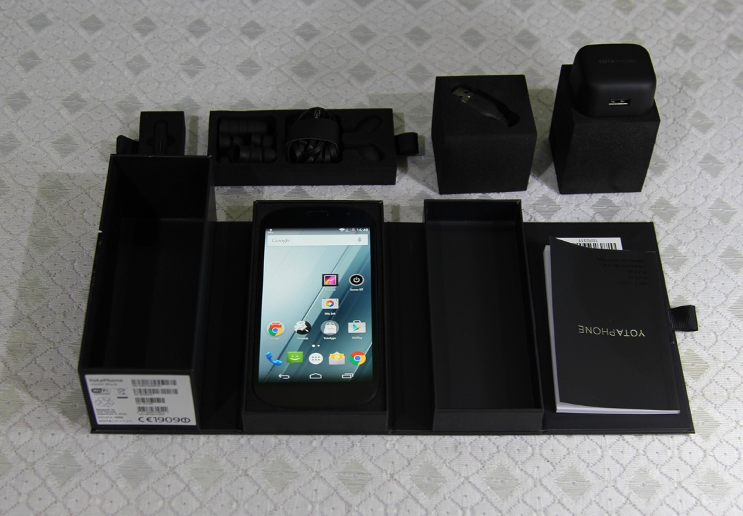 | Hộp đựng của Yotaphone được thiết kế không khác gì những mẫu điện thoại siêu sang. Nó được làm màu đen sang trọng, sạc, cáp, tai nghe đều được bọc xốp, có vỏ bao riêng độc đáo. |