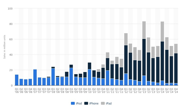 Năm ngoái, tốc độ tăng trưởng của Apple chỉ còn 7%, đạt 182,8 tỷ USD. Doanh thu iPhone đạt 102 tỷ USD. iPhone vẫn đóng góp lớn vào doanh thu cũng như lợi nhuận của Apple. Năm 2014 đánh dấu sự sụt giảm của iPad, mất 5% doanh thu, trong khi iPod bắt dầu rơi vào giai đoạn bị lãng quên.
