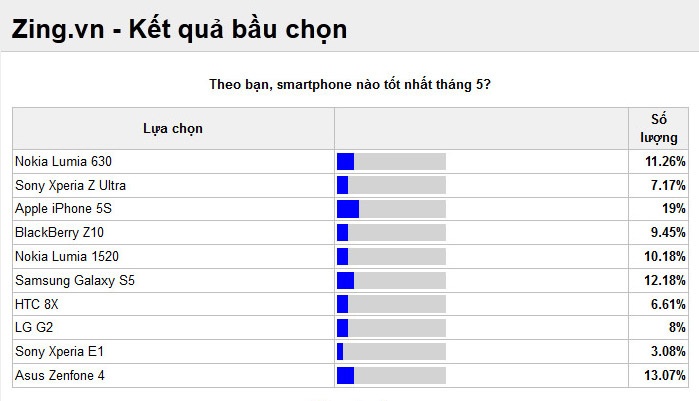 Zing.vn vừa công bố thứ hạng 10 smartphone tốt nhất tháng 5, trong đó có thêm một bảng xếp hạng do chính độc giả bình chọn. Sau 36 tiếng đồng hồ, bản danh sách 10 smartphone tốt nhất tháng đã nhận được hơn 30.000 lượt bình chọn, trong đó iPhone 5S chiếm 19%, trở thành smartphone được độc giả yêu thích nhất trong tháng qua.