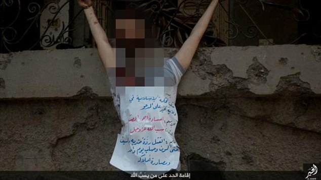 | IS treo xác người đàn ông lên tường sau khi chặt đầu. Ảnh: Daily Mail |