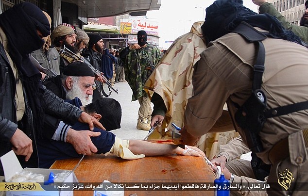 Phiến quân IS tại Iraq tiếp tục công bố những hình ảnh mới về vụ chặt tay những người phạm tội trộm tài sản. Những bức ảnh cho thấy cảnh phiến quân IS bơm thuốc giảm đau và cầm máu cho tội nhân tại thành phố Mosul của Iraq trước khi "đao phủ" chặt tay họ, Daily Mail đưa tin.