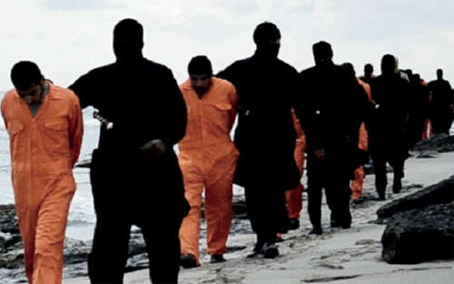 Một số trang web của IS ở Libya đã cho lưu hành cuốn băng video chiếu cảnh các nạn nhân dàn hàng ngang trong trang phục màu cam bị hành quyết dã man gần bờ biển.
