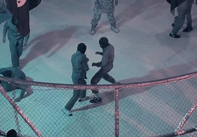 Những người trong lồng phải chiến đấu tới khi một người gục xuống sàn. Rất có thể đây là cảnh tượng trong một trại huấn luyện của IS ở Iraq. |