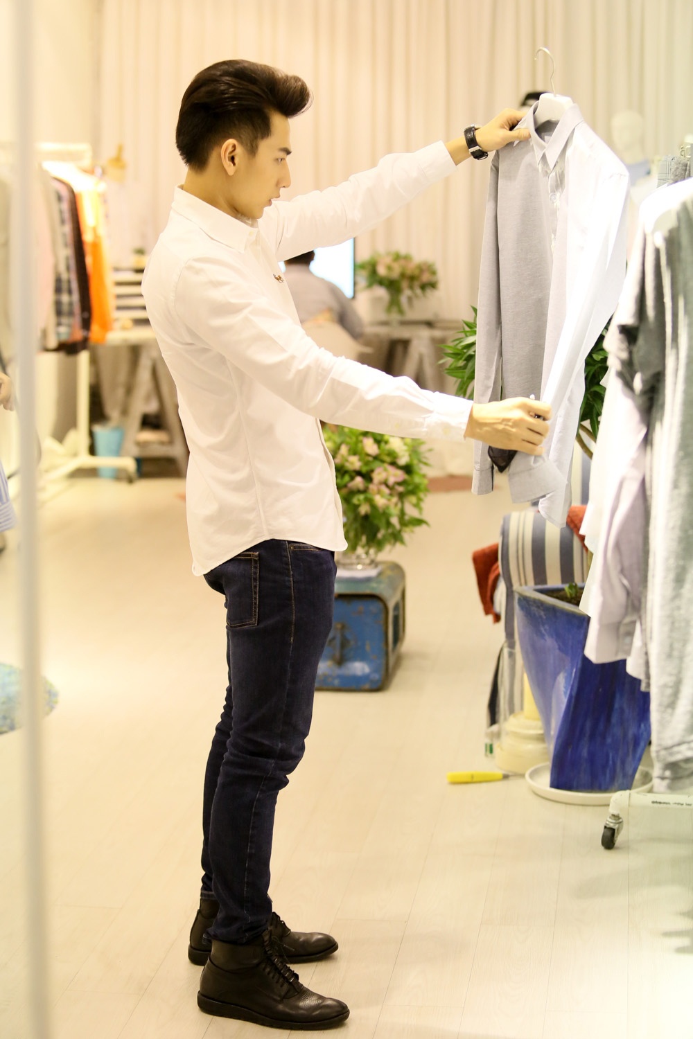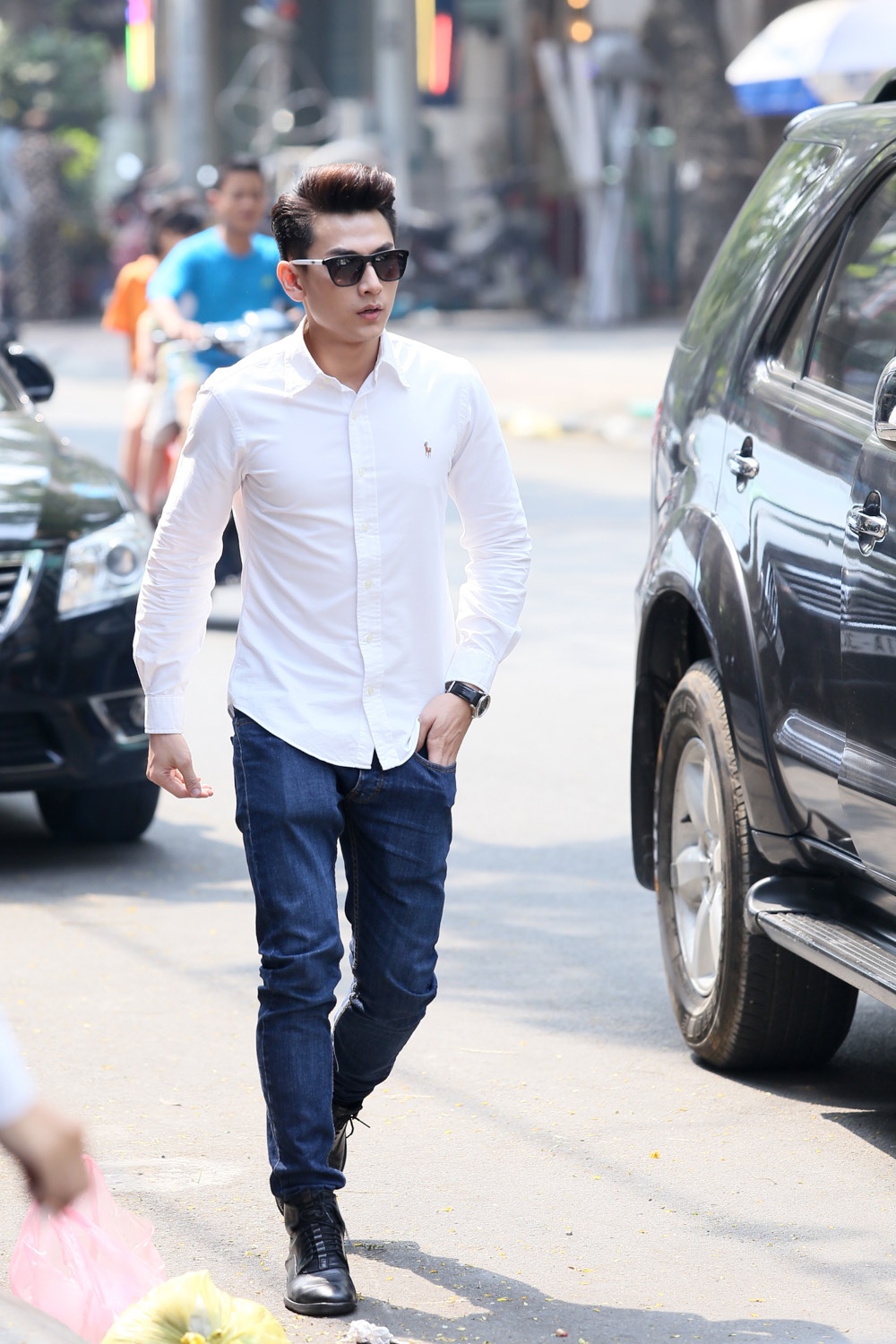 | Trưởng nhóm nhạc 365 điển trai và nam tính với áo sơ mi trắng, quần jeans kết hợp cùng giày cao cổ khi xuống phố. |