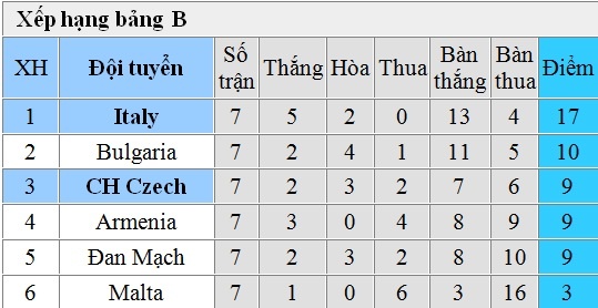 Cuối tuần qua, Italy đã có một trận đấu khó nhọc trước Bulgaria. Tuy nhiên, điều quan trọng nhất là thầy trò HLV Prandelli đã đạt được điều họ muốn, đó là 3 điểm trọn vẹn nhờ chiến thắng sít sao 1-0. Kết quả đó đã giúp Azzurri củng cố vững chắc ngôi vị số 1 tại bảng B với 17 điểm sau 6 vòng đấu, hơn đội đứng thứ 2 là Bulgaria 7 điểm.
