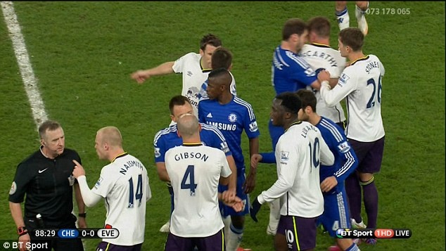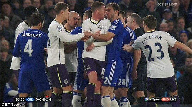 | Tình huống diễn ra ở phút 89 cuộc so tài giữa Chelsea và Everton trong khuôn khổ vòng 25 Premier League. Trong khi các cầu thủ hai đội lao đến phản ứng với trọng tài Jon Moss sau pha bóng Willian bị phạm lỗi, hậu vệ Branislav Ivanovic đã có hành động không đẹp với tiền vệ James McCarthy của đội khách. |