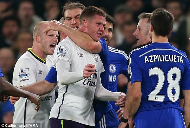 | ... trước khi ghé sát đầu vào vai tiền vệ của Everton, một hành động như thể muốn cắn đối thủ. |