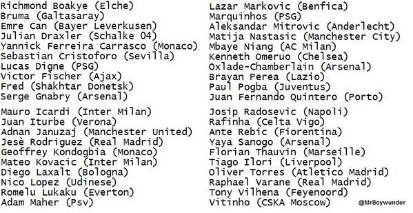 | Danh sách 40 ứng viên cho danh hiệu "Cậu bé Vàng châu Âu 2013". |