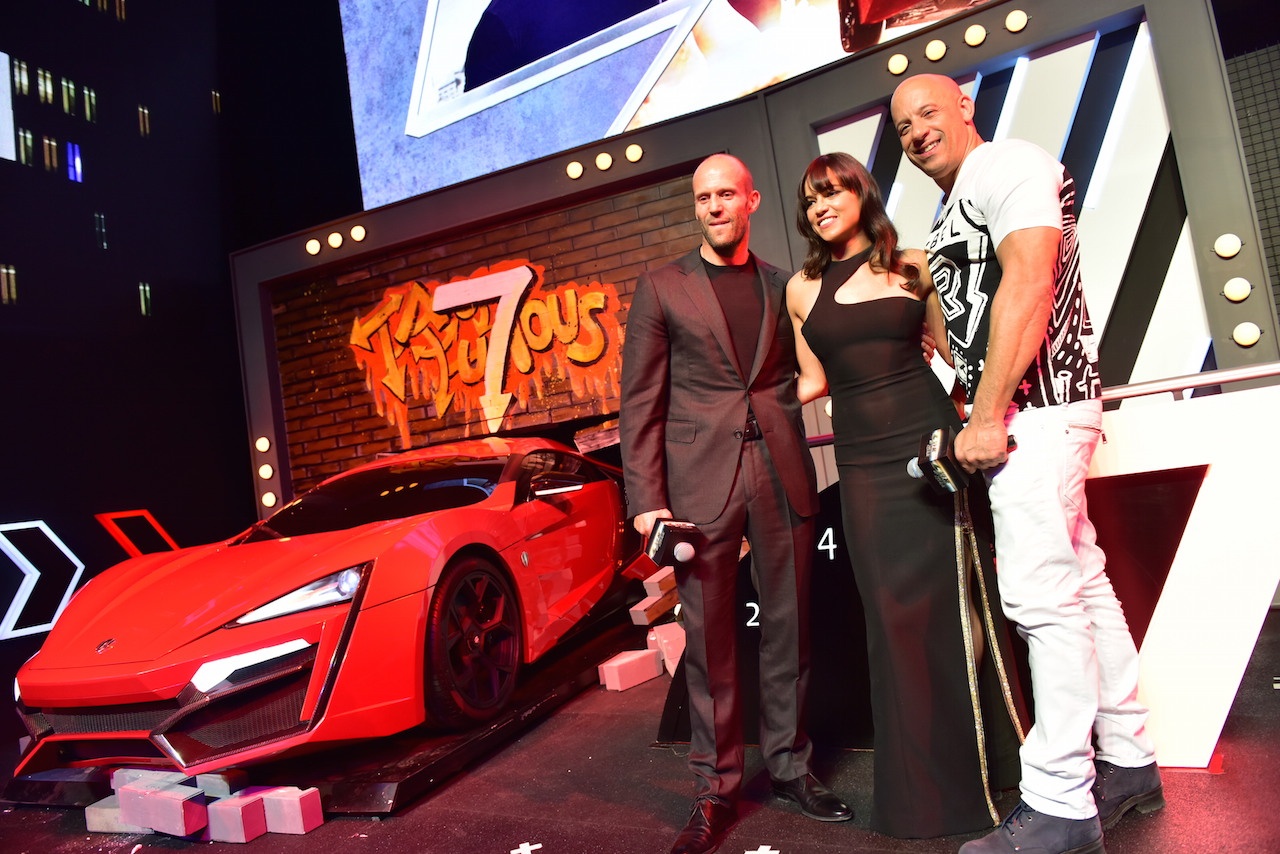 Ba ngôi sao của Fast & Furious 7 bên cạnh chiếc Lykan HyperSport. |