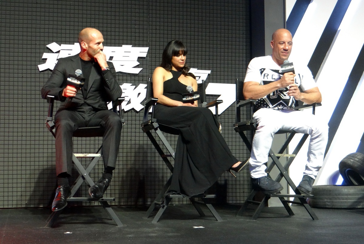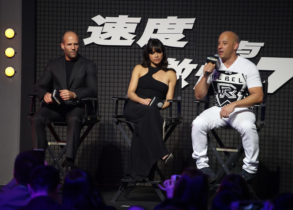 Tối 26/3, Fast & Furious 7 tổ chức buổi họp báo ra mắt tại Bắc Kinh, Trung Quốc. Tham gia sự kiện có ba ngôi sao của bộ phim là Vin Diesel, Jason Statham và Michelle Rodriguez. |