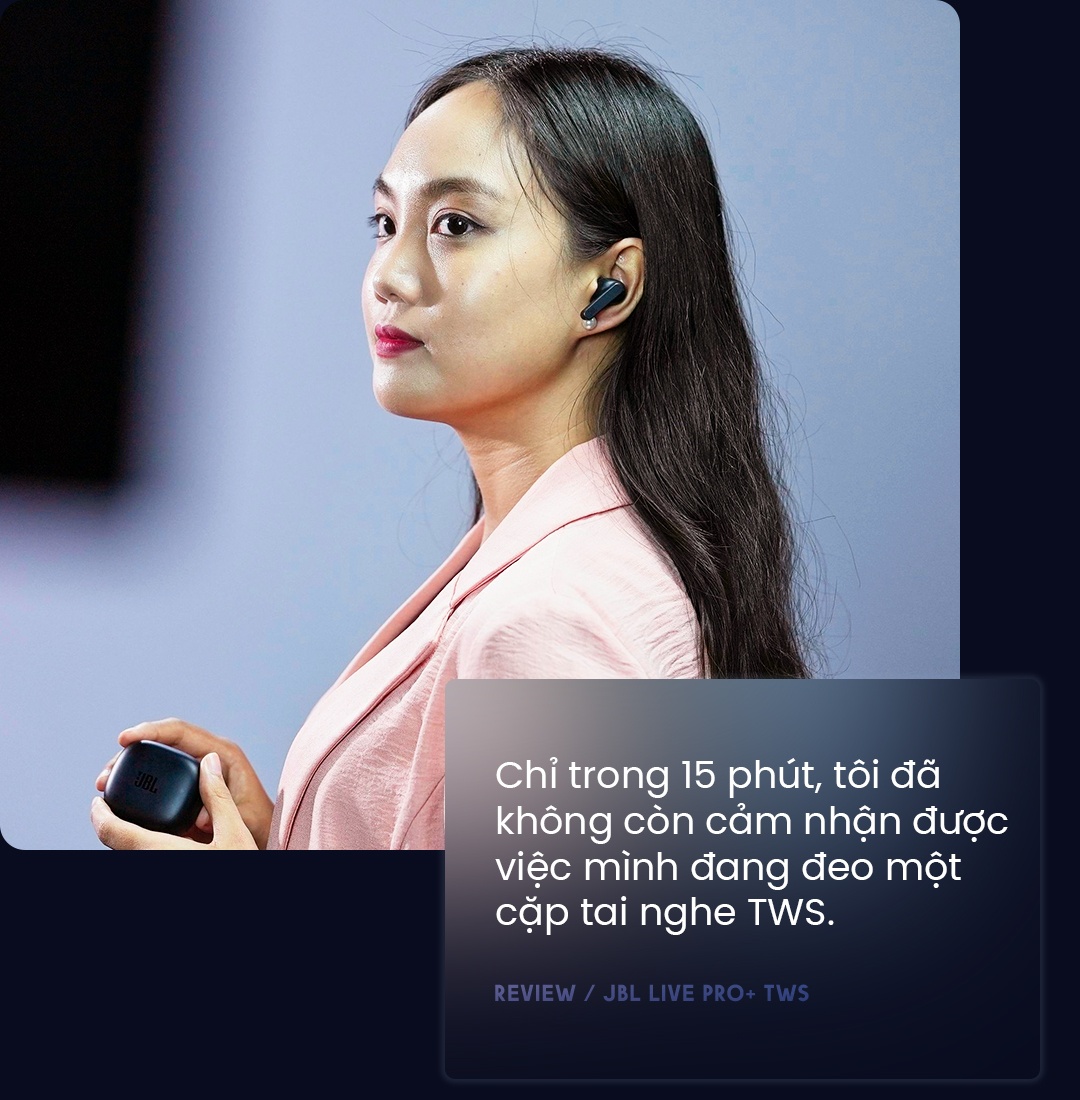 Trải nghiệm 3 giờ đeo liên tục JBL Live Pro+ TWS, tôi không cảm thấy nặng hay cấn tai. Thậm chí, chỉ trong 15 phút, tôi đã không còn cảm nhận được việc mình đang đeo một cặp tai nghe TWS.