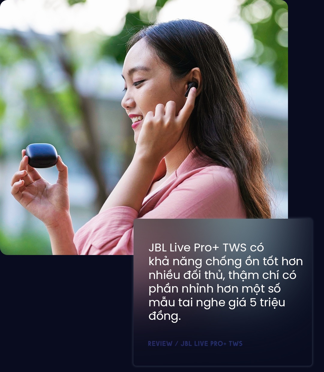 Trong khi đó, JBL Live Pro+ TWS cần bằng tốt khả năng chống ồn. Khi đeo ở mức chống ồn cao nhất, tôi vẫn không cảm thấy tai bị ù. Các âm thanh nền như tiếng quạt, xe cộ chạy trên đường được giảm xuống ở mức tốt nhất.