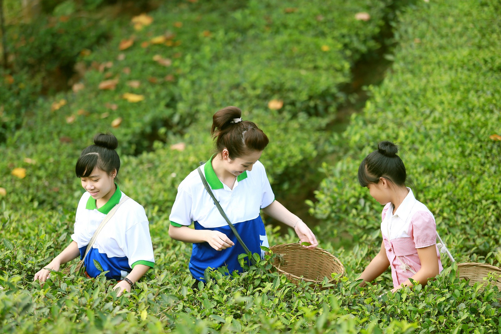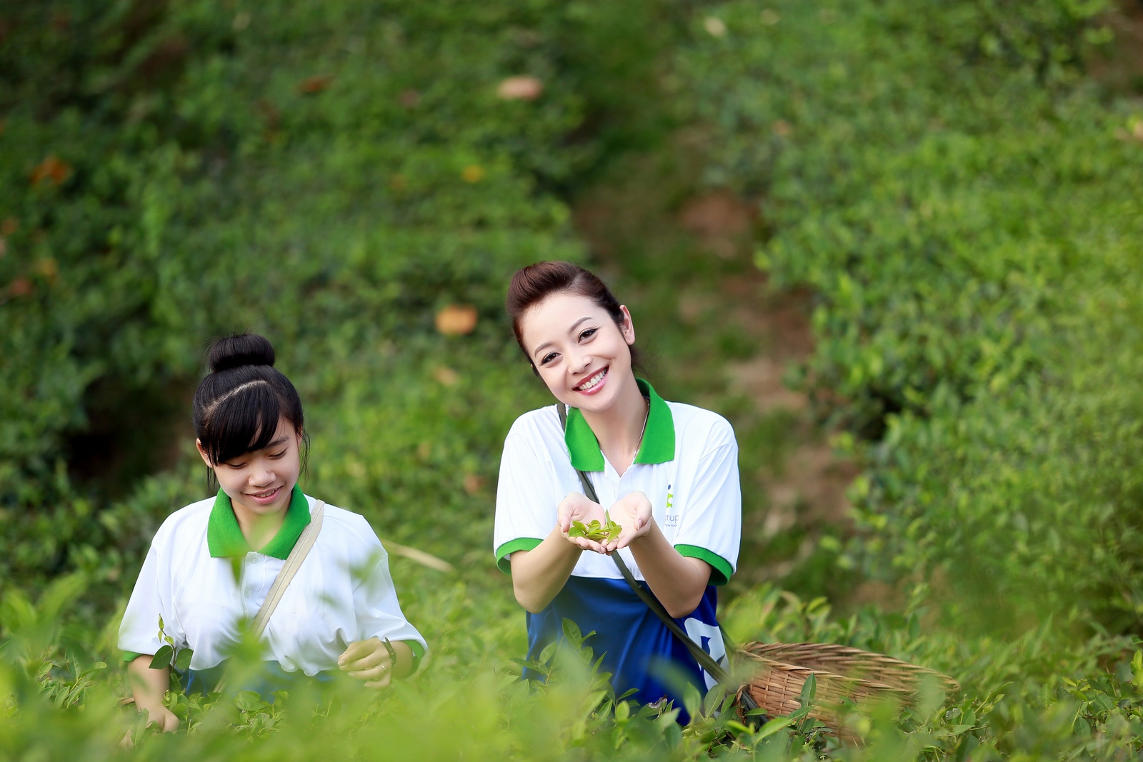 Chiều 22/10, tiết trời Yên Lập (Phú Thọ) khá âm u. Jenifer Phạm đi cùng các em học sinh lên đồi chè hái. |