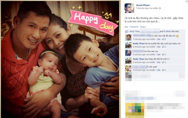 | Cách đây ít phút, trên trang cá nhân, Jennifer Phạm bất ngờ chia sẻ hình ảnh vợ chồng cô chụp cùng hai con. Trong hình, cô và doanh nhân Đức Hải không giấu nổi niềm hạnh phúc khi cả gia đình yêu thương nhau. |