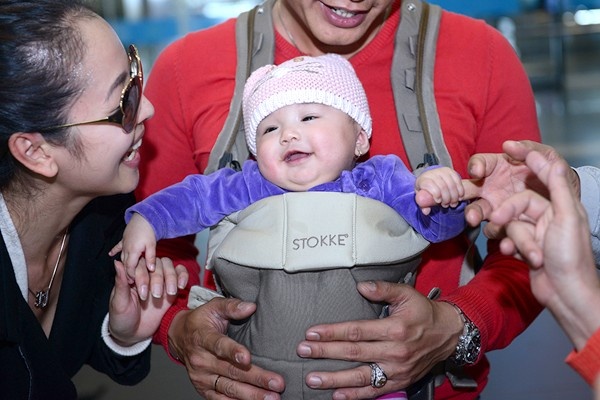 | Nếu bé Bảo Nam bảnh bao, cười duyên trong vòng tay mẹ Jennifer, tiểu công chúa lại lè lưỡi đầy lém lỉnh và đáng yêu khi được bố bế. |