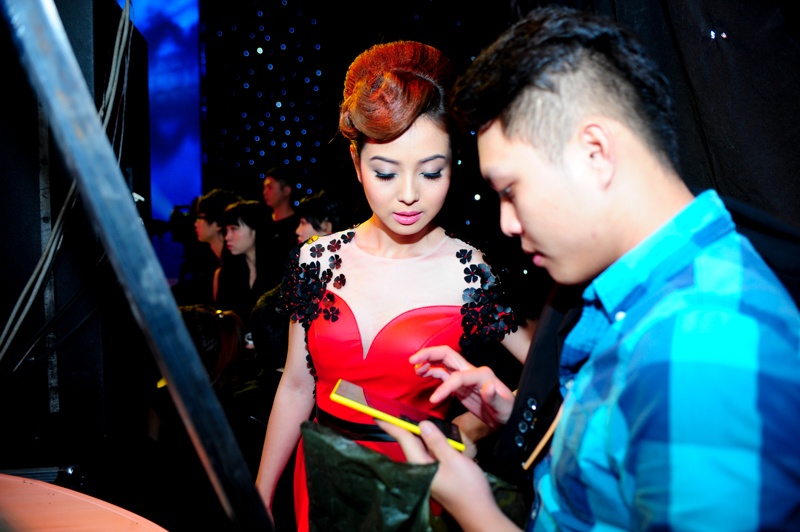 Dàn người mẫu đứng trò chuyện trong khi một khách mời đang hát khiến không gian bị xáo trộn. |