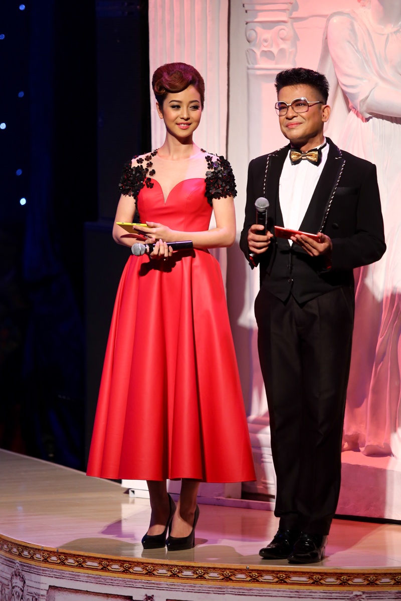 Jennifer Phạm chọn váy đỏ rực rỡ, sang trọng và quý phái rất vừa vặn khi đứng cạnh Thanh Bạch trên sân khấu. Mặc dù đã có hai con nhưng người đẹp vẫn giữ được vóc dáng thon gọn và một nhan sắc trời ban. Vì trục trặc của khâu kỹ thuật khiến cô mắc lỗi trong những giây đầu tiên. Tuy nhiên người đẹp cũng lấy lại phong độ nhờ lối nói chuyện tự nhiên, không màu mè và cách dẫn khá ổn định, an toàn. |